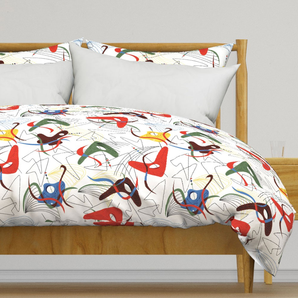 This design is a lively reinterpretation of mid-century modern abstract patterns, characterized by bold, biomorphic shapes in vibrant red, yellow, green, and blue. Thin, intersecting boomerangs flows throughout the design, creating movement and connecting the elements with playful precision. The organic forms, dotted accents, and dynamic overlapping shapes reflect the experimental spirit of 1950s design, blending artistic spontaneity with structured geometry.