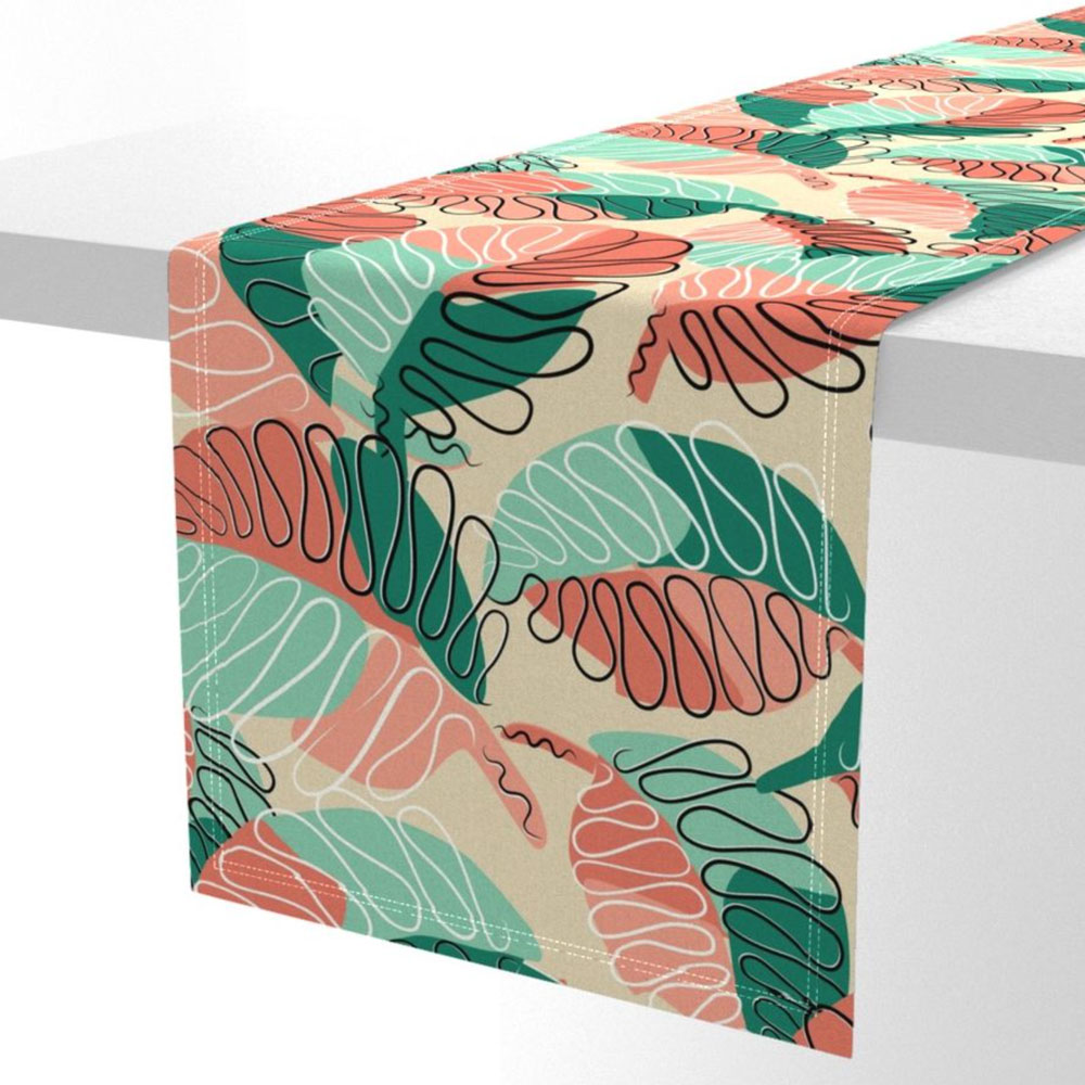 This fabric design takes inspiration from a 1950s pattern, showcasing a layered arrangement of hand-drawn leaves with detailed veins and organic contours. The soft coral, mint green, and cream tones reflect the muted yet lively color palettes popular in mid-century design. The overlapping leaves create a dynamic, flowing composition, while the intricate line work adds texture and depth. This pattern is a modern reimagining of classic 1950s aesthetics, blending timeless design principles with a natural, artistic feel.