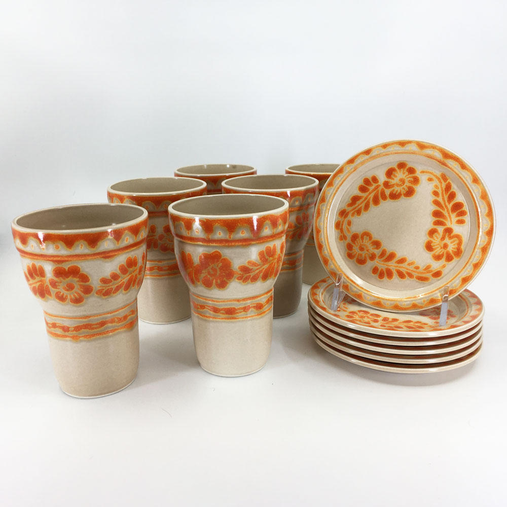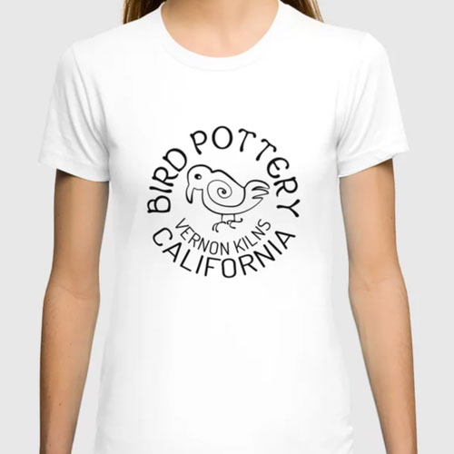 The artist and potter William “Harry” Bird designed for Vernon Kilns and Bauer in the mid- to late-1930s. Little is known about Bird – there are rumors that he rented space in Vernon’s plant; there is no indication that he was an employee of the company and may have produced his work under contract or self-distributed. All of Harry Bird’s designs were produced on Vernon’s “Montecito” shape (Early California and others). Bird may have been the first to leverage the in-glazing technique of decorating, also used by Pacific Pottery on their decorated ware starting around 1935.