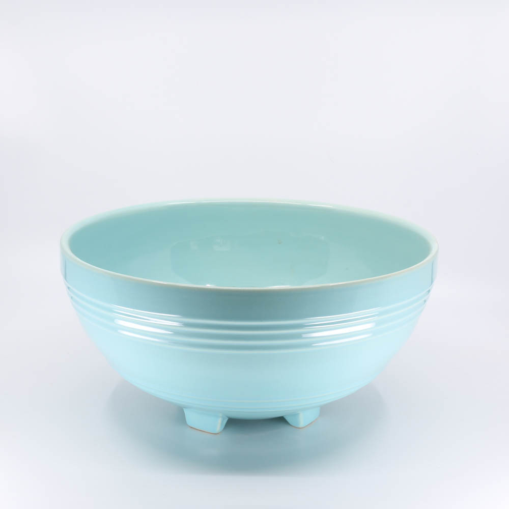Pacific produced three sizes of this bowl: #312 14″ footed punch bowl, #311 11″ footed salad bowl, and the #310 9″ footed salad bowl. These bowls can be found in either of two styles. The early period style features multiple thin rings around the circumference, shifting to the standard “three-ring” style of the later period.